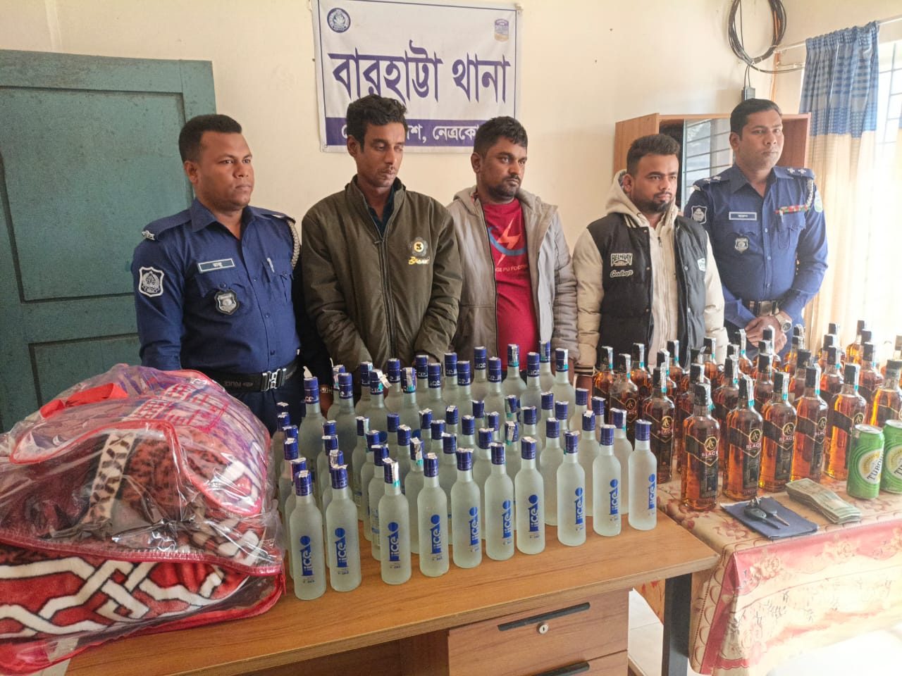 ড়ে তল্লাশী চালিয়ে গাড়ির ভিতর ভারতীয় বিভিন্ন ব্রান্ডের ৯৬টি মদের বোতল, ২টি বিয়ারের ক্যান গ্রেফতার ব্যক্তিদের দেহ তল্লাশি করে ৫টি মোবাইল হ্যান্ডসেট, ৪১ হাজার ৩০০ টাকা পাওয়া যায়। মদের বোতলগুলো বিশেষ কায়দায় কম্বলের ভাঁজে লুকিয়ে রাখা হয়েছিল। কম্বলগুলোও ভারতীয়।
