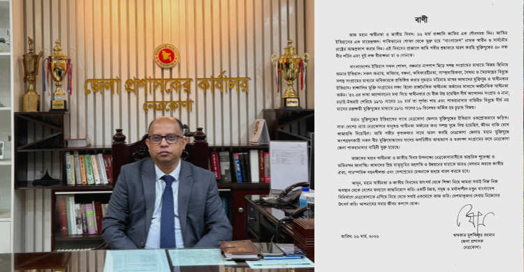 আসুন, মহান স্বাধীনতা ও জাতীয় দিবসের তাৎপর্য থেকে শিক্ষা নিয়ে আমরা সবাই নিজ নিজ অবস্থান থেকে দেশের কল্যাণে আত্মনিয়োগ করি। একটি উন্নত, সমৃদ্ধ ও মর্যাদাশীল নতুন বাংলাদেশ বিনির্মাণে নেত্রকোণাকে এগিয়ে নিয়ে যেতে সবাই একযোগে কাজ করি। দেশমাতৃকার সেবায় নিজেদের উৎসর্গ করি। আপনাদের সবার জীবন কল্যাণ হোক।